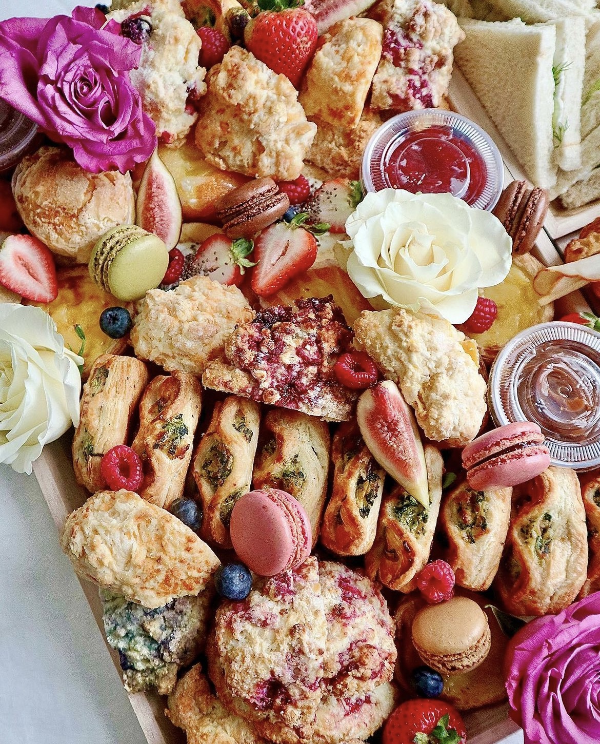 Pastry assortment includes savoury spinach & feta bakes, sweet & savoury scones with jam, pastry shells with vanilla & lemon cream topped with berries, assorted tarts and macarons. The tea cakes include an assortment of options such as mini vanilla pound cakes, carrot cake, pecan cheesecake, chocolate fudge, raspberry cream. Afternoon tea sweet treats also include cream rolls filled with fresh vanilla custard, strawberry & cheese danish, buttercream cupcakes topped with fresh figs.