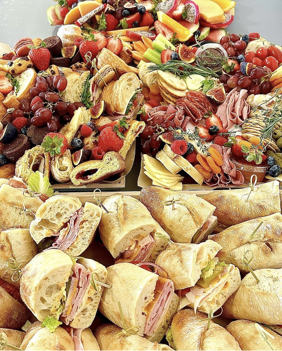 Large (16″) Fruit Platter, Small Brunch Pastry Platter (14 x 12″), Small Cheese & Charcuterie Platter (14 x 12″), and Large Sandwich Platter (15-18 sandwiches/ halved)